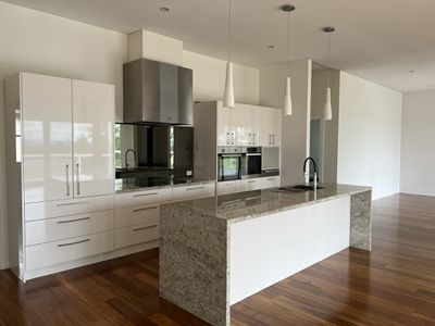 Comprising a spacious open plan kitchen with Miele appliances, two ovens, 5 burner induction cooktop, warming drawer, dishwasher, space for a wine fridge and larger fridge space with water available to plumb in your fridge, ample storage, following into adjoining large dining/ living area with double glazed windows and Spotted Gum floorboards, Coonara wood fire and vastly spacious separate movie/lounge room and ornamental fireplace.