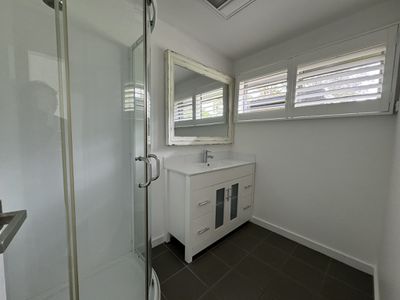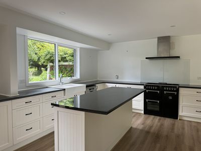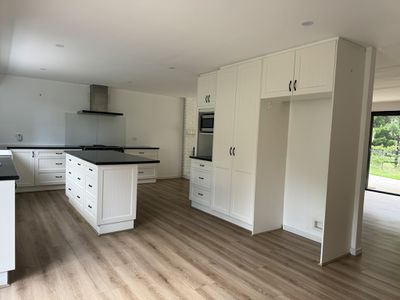 On entry, you are greeted with the standout kitchen; a country chic design of sleek black and white features with fixed island bench and a copious amount of storage.