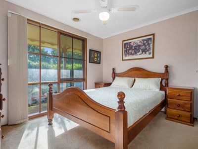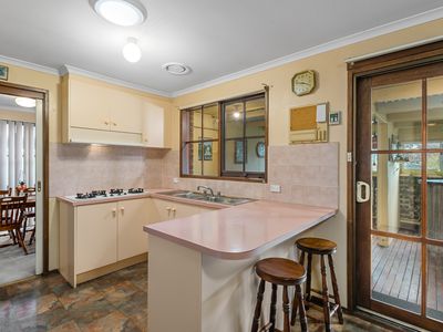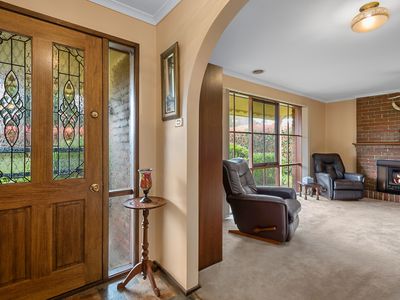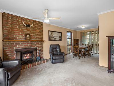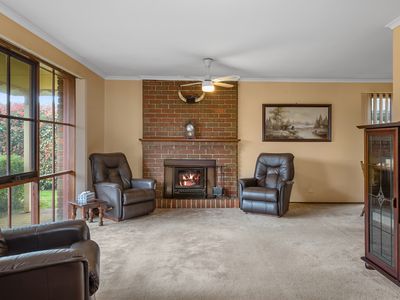 Inside, a neat and tidy kitchen with gas cooking appliances, pantry and adjoins the dining area, flowing easily to the outdoor entertainment space. The welcoming family room at the front of the home overlooks the gardens and is warmed by ducted heating and a cosy wood fireplace, perfect for gathering with loved ones. Accommodation includes a master bedroom with walk-in robe and ensuite, plus two additional bedrooms with built-in robes, serviced by the central family bathroom.