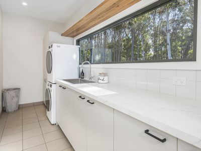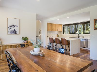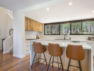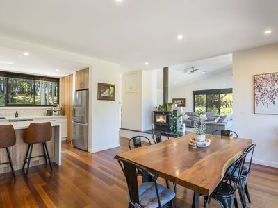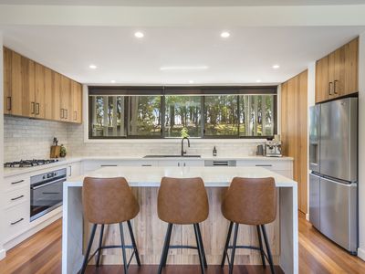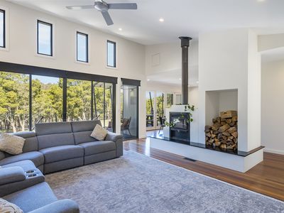 At the heart of the home, a brand-new stone kitchen with Blackbutt cabinetry and island bench flows into the dining and lounge spaces, where bi-fold doors open to an elevated alfresco terrace. Hardwood floors, ducted gas heating/cooling, and a double-sided woodfire ensure year-round comfort. A powder room, central bathroom, and laundry with a view complete the layout.