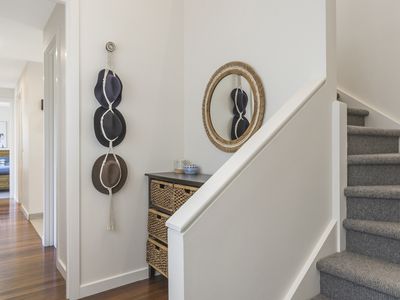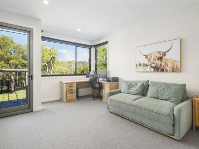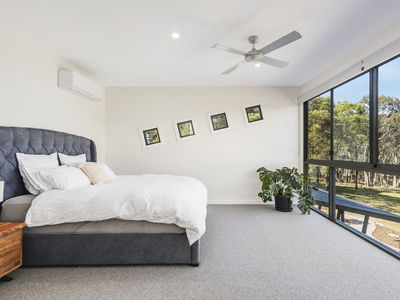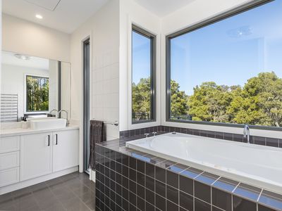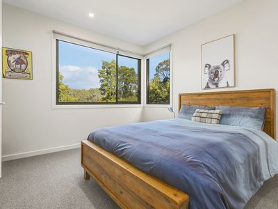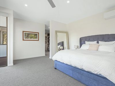 The entire upper level is devoted to the Master Suite - a private sanctuary featuring a walk-in robe, bar, split system AC, and an ensuite with bay-windowed spa bath.