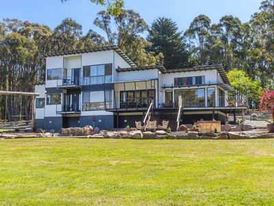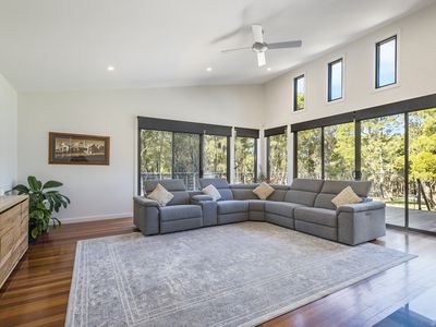 Set on approximately 22.3 acres of beautifully curated grounds, the residence spans two light-filled levels with striking pitched ceilings and a design that celebrates its outlook. Every one of the four bedrooms captures sunrise views, with private balconies to soak up the scenery.
