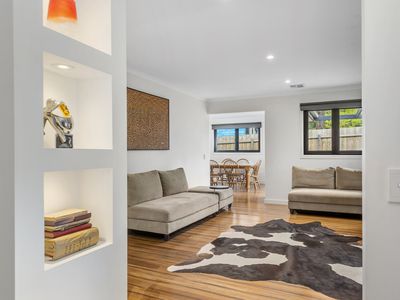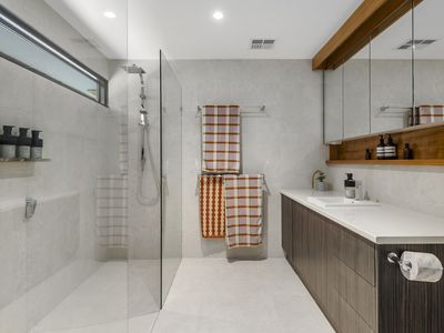 Inside, the thoughtful layout includes three spacious bedrooms, each with a walk-in robe, and two luxurious bathrooms. The ensuite features a double shower, custom cabinetry, and floor-to-ceiling tiles, while the main bathroom showcases a freestanding bath and sleek modern finishes. Natural light fills the home, with large hallway windows creating a seamless connection between indoors and out.