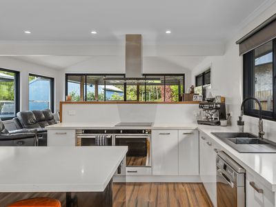 The open-plan kitchen serves as the heart of the home, boasting a stone island bench, twin Aniston electric ovens, induction cooktop, and walk-in pantry. Warm bamboo flooring, double glazing, zoned ducted heating, and a Heat Charm wood fireplace provide comfort throughout the seasons.