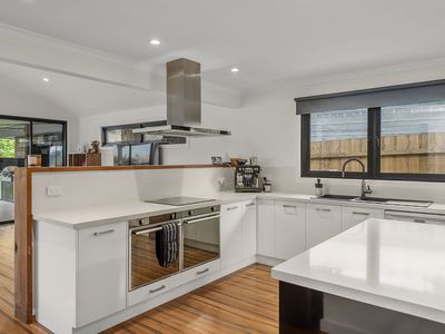 The open-plan kitchen serves as the heart of the home, boasting a stone island bench, twin Aniston electric ovens, induction cooktop, and walk-in pantry. Warm bamboo flooring, double glazing, zoned ducted heating, and a Heat Charm wood fireplace provide comfort throughout the seasons.
