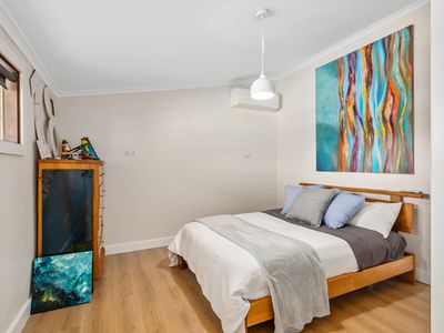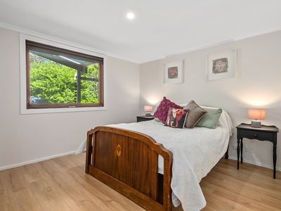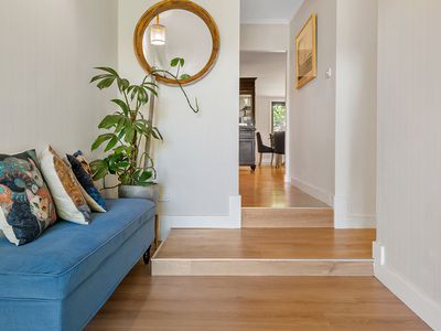 Designed for comfort and character, the home features a spacious updated kitchen featuring white gloss cabinetry and glossy black bench tops, beautifully renovated bathrooms, and a warm inviting ambience throughout.