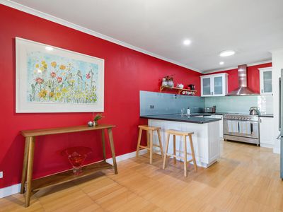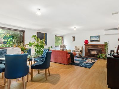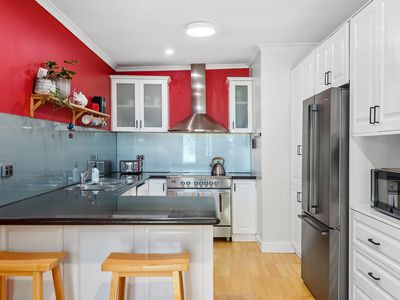 Designed for comfort and character, the home features a spacious updated kitchen featuring white gloss cabinetry and glossy black bench tops, beautifully renovated bathrooms, and a warm inviting ambience throughout.