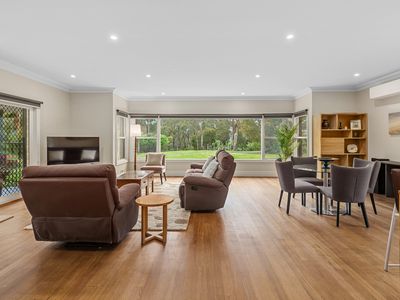 The home offers two living zones, providing flexibility for both family time and quiet relaxation. The open-plan living area with its fireplace and new flooring creates a welcoming space to gather, while a separate carpeted lounge offers a more private retreat. Neutral tones throughout create a feeling of light, space and relaxation, enhanced by beautiful outlooks from the full-length windows.