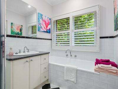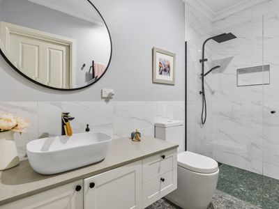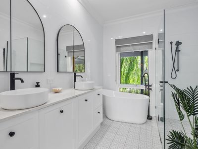 This home offers four spacious bedrooms plus a study, each offering generous wardrobe space. The master suite is a true retreat with its walk-in robe with mirrored doors and a luxurious ensuite featuring a Japanese soaker bath and double vanity.