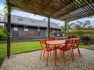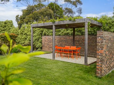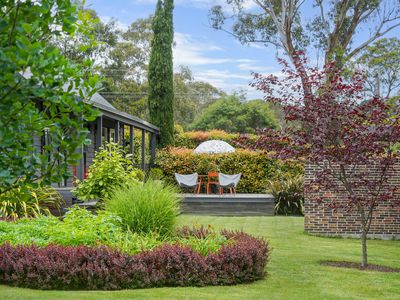 Outdoors, the home really comes into its own. Wide Blackbutt decking flows from the living area to a big entertaining zone and pergola, while the brick-walled garden - built from Danish-made bricks hand-selected and imported by the owners - creates a magical outdoor dining room. Established garden beds, sweeping lawns and a dedicated vegetable garden area offer room to grow, play and entertain.