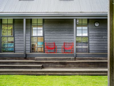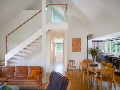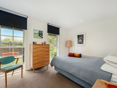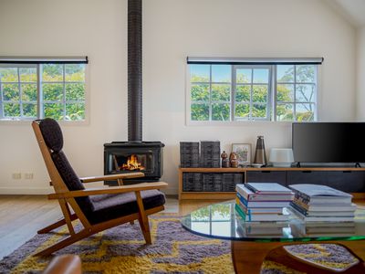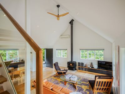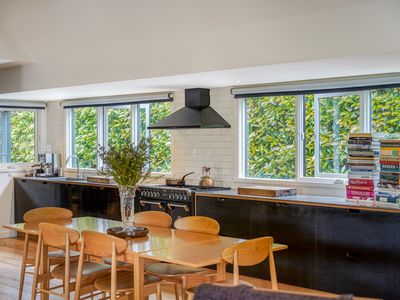 Inside, high-quality engineered American Oak floors, vaulted ceilings and a calm, neutral palette create an immediate sense of warmth. The open-plan living and dining area is centred around a wood fire, supported by split-system heating and cooling and partial double glazing for year-round comfort. A long, contemporary kitchen runs along the northern side of the home, featuring an English Belling oven, ASKO dishwasher and VIPP tapware all looking out to the lush green hedge.