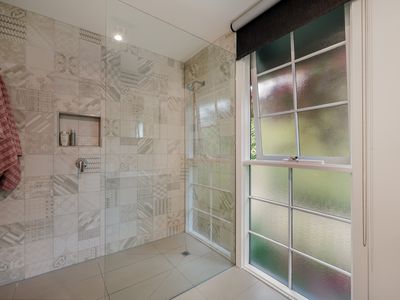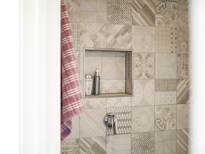 - Stylish bathroom with feature tiling and VIPP tapware.