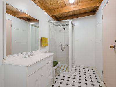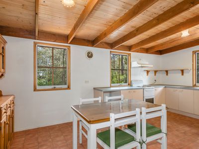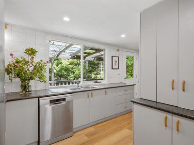 A light and bright functional galley style kitchen with an adjoining dining area, has a lovely leafy overlook over the verandah and surrounding gardens.