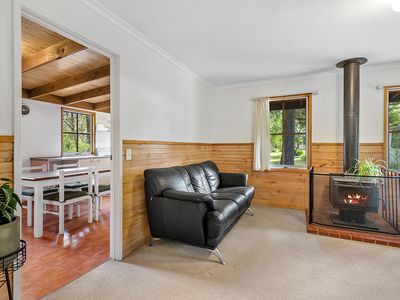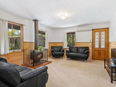 Instantly appealing the main residence has the wow factor with a storybook style cottage with wide verandahs inviting you into a warm and relaxing family home. At its heart is the stunning living room with a striking stone fireplace with Eureka wood heater as its centre piece. An ideal place for cosy family gatherings with soaring ceilings and light-filled spaces overlooking leafy outlooks. Additional heating/cooling is provided by split system heating and cooling for added convenience.