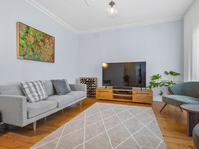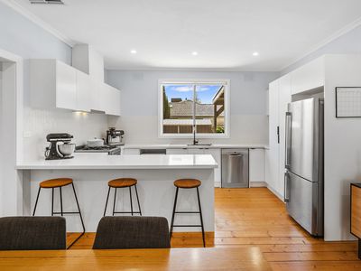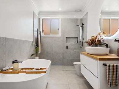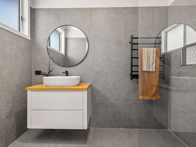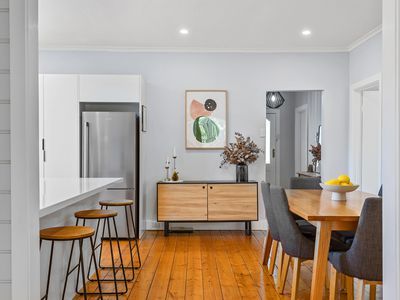 Accommodation is generous with three large bedrooms with robes and main with ensuite (walk- -in shower). The renovated main bathroom is an impressive size, beautifully finished and complete with a semi-freestanding bath - perfect for long soaks at the end of the day. A practical laundry with external access completes the floorplan.