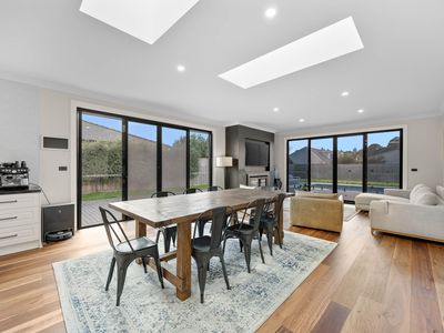 The heart of the home is an expansive open-plan living and dining zone, enhanced by warm timber flooring, a striking gas log fireplace, and large sliding doors that open directly to the deck and pool area. Skylights flood the space with natural light, creating a bright and welcoming atmosphere year-round.
