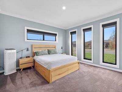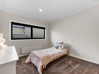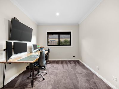 Accommodation is generous and flexible, offering four bedrooms, a dedicated study, two living zones, two bathrooms, and a powder room. Bathrooms include heated flooring and towel rails, while hydronic heating in every room, double-glazed windows, and split-system air conditioning ensure comfort in every season.