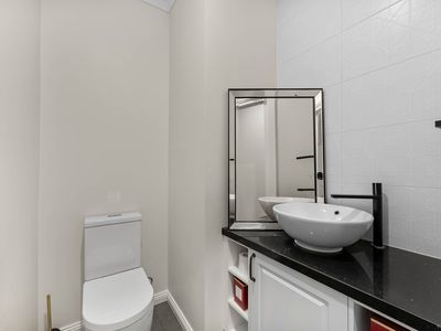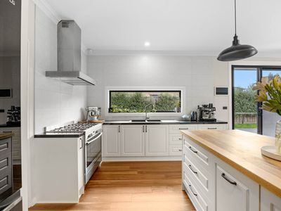 The contemporary kitchen is both functional and refined, featuring quality appliances, ample bench space, a plumbed refrigerator, food disposal, and a fully equipped butlers pantry with its own sink and dishwasherideal for entertaining and everyday family life.