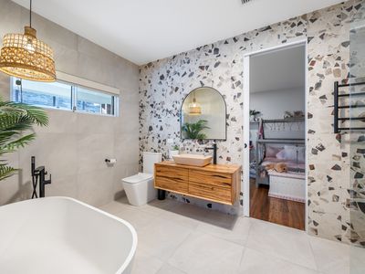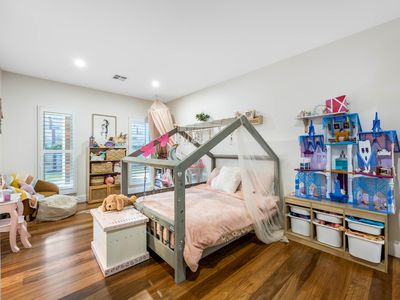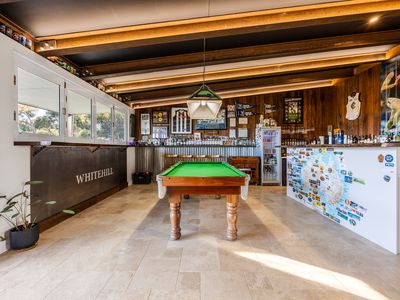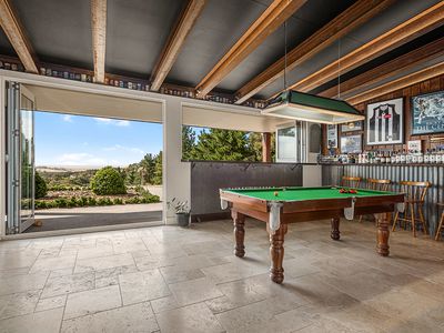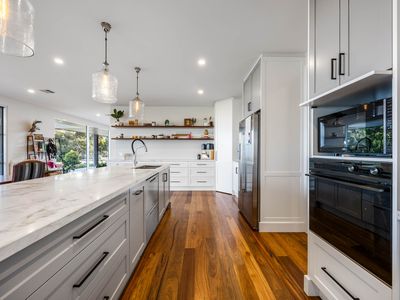 Multiple living zones, including a sophisticated lounge and a character-filled rumpus with bar, cater seamlessly to relaxed family living and large-scale hosting. The Hamptons-inspired kitchen, finished with marble surfaces and premium appliances, anchors the home with understated elegance and functionality.