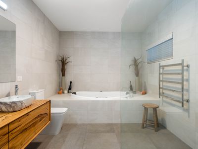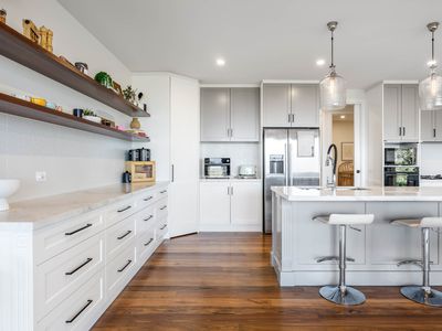 Designed to impress both visually and practically, the residence showcases expansive glazing, vaulted clerestory windows and Spotted Gum flooring, creating light-filled interiors that flow effortlessly to a substantial bluestone alfresco deck the perfect setting for entertaining against a spectacular backdrop.