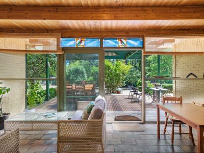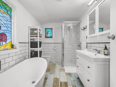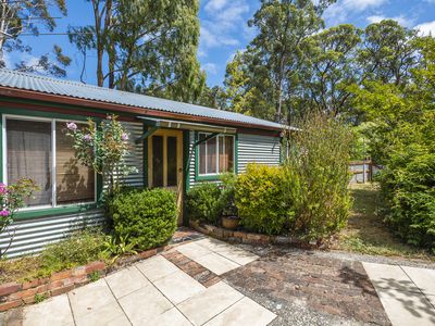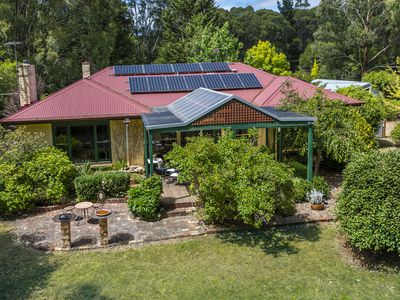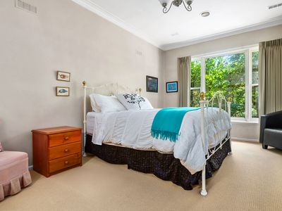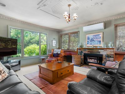 Large picture windows frame leafy garden and bush outlooks, drawing natural light into the home throughout the day. Ornate cornices, detailed ceilings, art deco features and stained glass add colour and charm, while wood fire heating and split system heating and cooling ensure year round comfort.