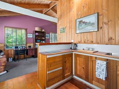 Privately positioned away from the main residence, the self contained cottage offers excellent flexibility. It includes one bedroom, a living area, kitchenette and bathroom, making it ideal for extended family, guests, creative use, working from home or additional accommodation.