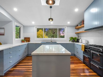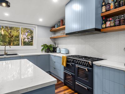 The well-appointed custom kitchen combines practicality and style, complete with stone benchtops, a Belling oven with gas cooktop, walk-in pantry and integrated dishwasher.