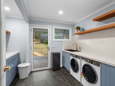 - Oversized laundry with stone benchtops and integrated drying racks